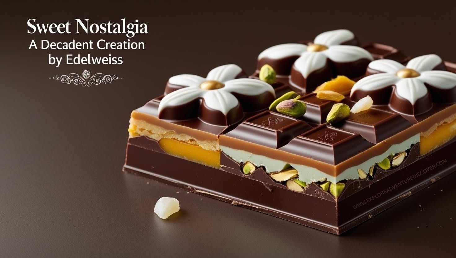 This is everything I love in one bite—not too sweet, just perfectly balanced: dark chocolate—deep, grounding, and rich; salted golden caramel—smooth and comforting; pistachio nougat—soft, chewy, and just a little nutty; roasted pistachios—for a light, buttery crunch; and dried mango—bright and chewy, with a sweet-tart lift. Each petal-shaped piece is a gentle nod to the Edelweiss flower—rare, delicate, and quietly strong. I wanted it to feel nostalgic, like something you’d find tucked away in a box of memories. A little floral, a little earthy, and full of warmth.